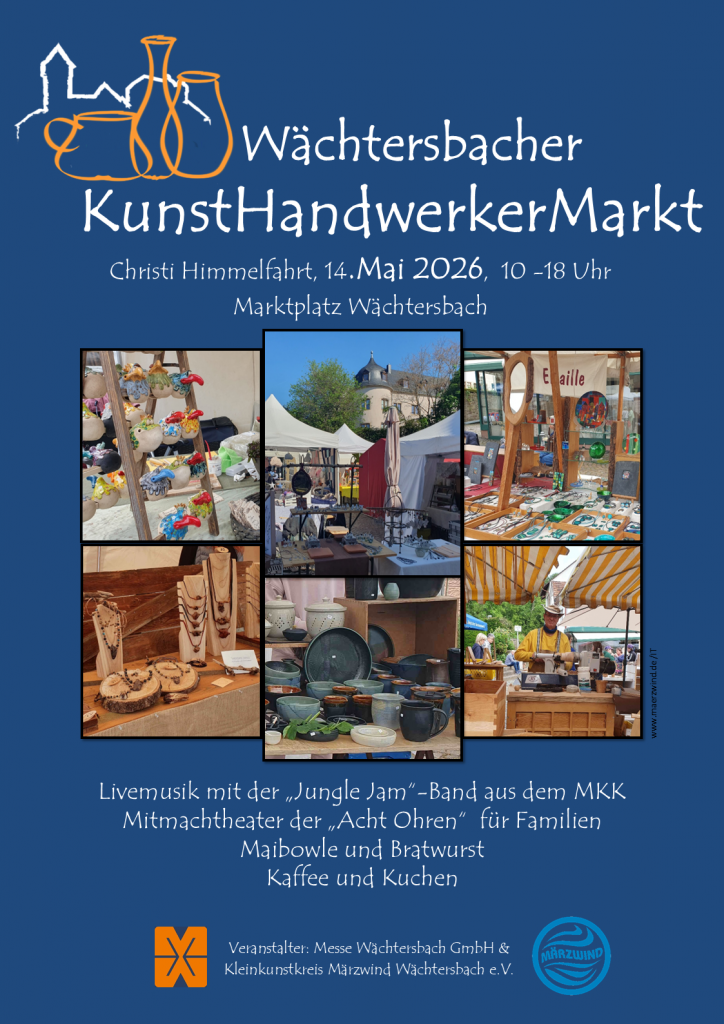 Alljährlich lockt der historische Marktplatz zum sommerlichen Einkaufsbummel mit einem nicht alltäglichen Angebot. Der Kunsthandwerkermarkt hat seinen festen Platz in der Wächtersbacher Messewoche an Christi Himmelfahrt. Märzwind organisiert ihn in Kooperation mit der Stadt Wächtersbach.