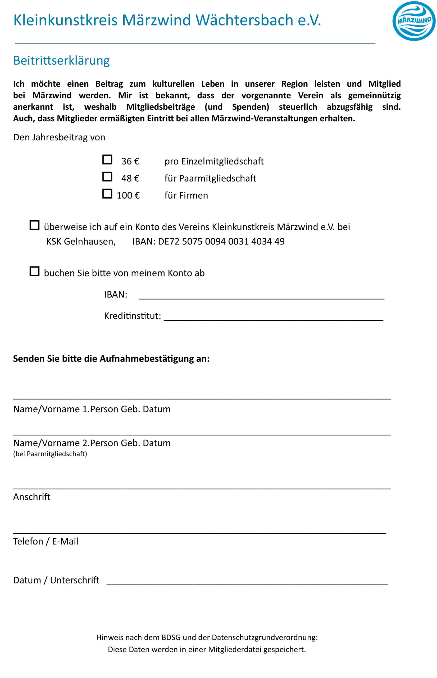 Sie möchten sich auch gerne für die Kulturszene in Wächtersbach engagieren? Wir freuen uns auf Sie. Melden Sie sich einfach per Mail oder telefonisch bei uns oder laden Sie gleich die Beitrittserklärung herunter.
